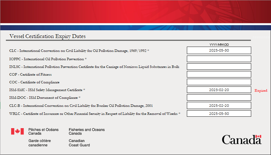 Si le navire fournit une date d'expiration incorrecte ou périmée pour un certificat, le formulaire indiquera « Expiré » à droite de la date.