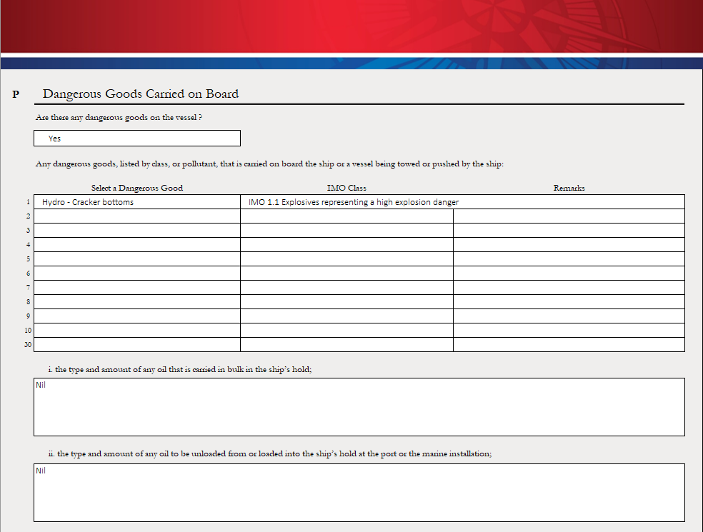 L’article P (ii) demande au navire d'indiquer «le type et la quantité d'hydrocarbures qui seront déchargés ou chargés dans la cale du navire dans le port ou à l'installation maritime». Si la question ne s'applique pas, indiquez Nil ou N/A.