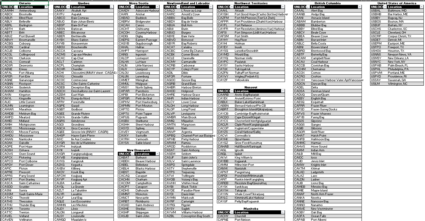 Le navire peut se référer à l’onglet UNLOCODE pour obtenir des informations relatives aux destinations ou aux noms de lieux en eaux canadiennes ou aux États-Unis. Quelques ports d’escale aux États-Unis ont également été inclus.
